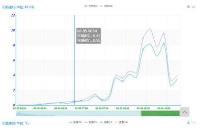 11、在线监测各环境因素参数的表现形式:A、清单明细式,可以直观地查看各个环境因素参数在某个时间点的监测数据。 B、曲线走势图显示方式,C、立柱式走势显示等。
